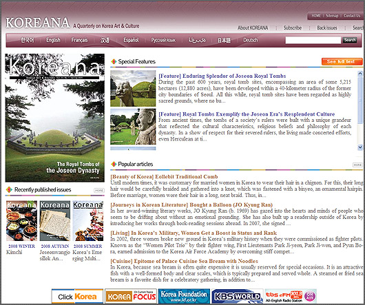 Koreana, eine Vierteljahreszeitschrift für koreanische Kunst und Kultur. die von der Korea Foundation seit 1987 herausgegeben wird, strebt an, das kulturelle Erbe Koreas weltweit bekannt zu machen sowie Informationen zu aktuellen künstlerischen und kulturellen Aktivitäten bereitzustel ...